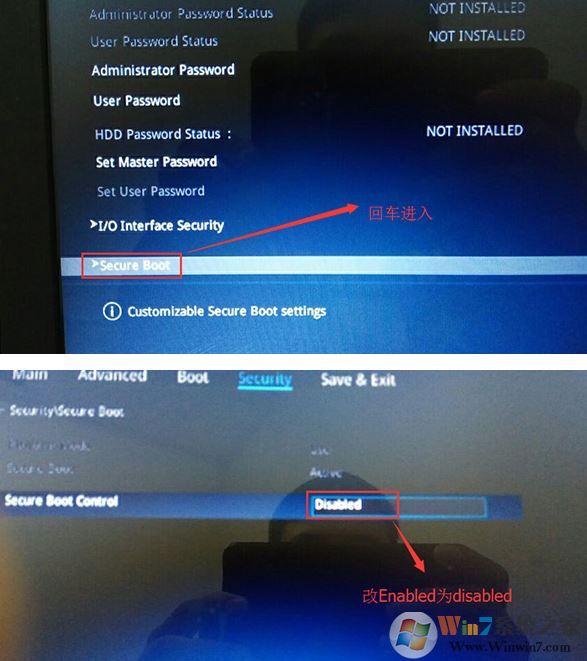 1、重启笔记本按esc进入BIOS设置,然后按F7进入高级模式,按→方向键移动到Security,选择Secure Boot,然后回车进入把Secure Boot control选enabled改为disabled关闭安全启动,然后按F10保存重启;