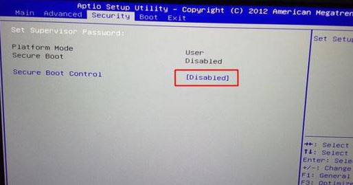 1、打开电脑电源,示后按F2进入BIOS设置,在Security下把Secure Boot Control设置为Disabled关闭安全启动,如下图所示;