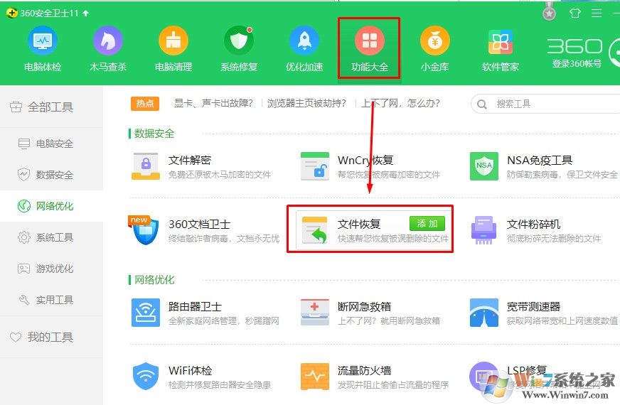 1、打开360安全卫士,选择功能大全--文件恢复。
