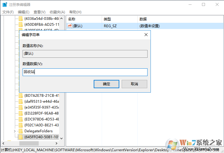 5、打开刚刚新建的项,点击右侧的“默认”,将其数值数据改为“回收站”。然后重启电脑即可。