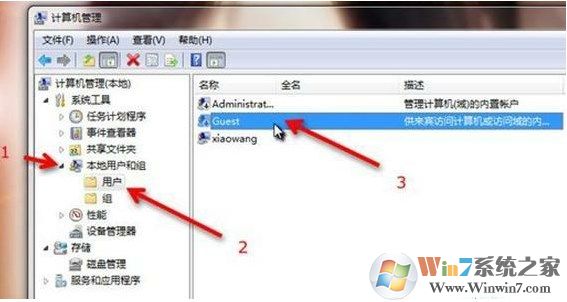 4、在“计算机管理”中,我们依次点击:本地用户和组—用户—Guest ,双击Guest 。