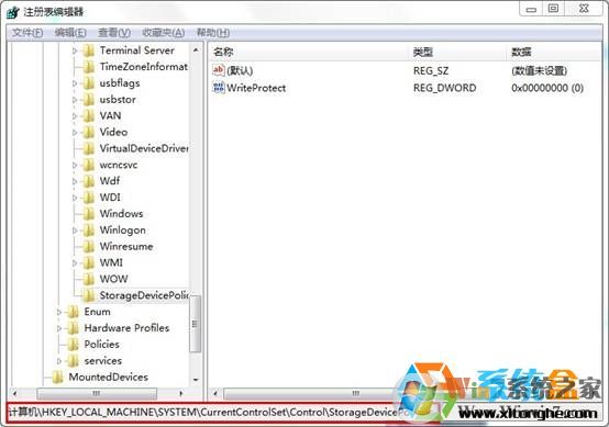 2、输入命令回车后,在注册表左右列表中依次展开HKEY_LOCAL_MACHINE\SYSTEM\CurrentControlSet\Control\StorageDevicePolicies 如下图所示