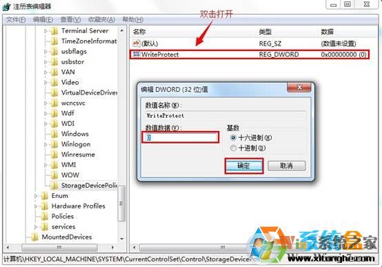 3、然后在右侧项目列表中找到“WriteProtect”Dword值,双击该项,将其中的数值更换为“0”,然后退出注册表。