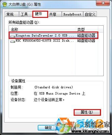 6、然后我们点击“硬件“标签,到硬件设置页面,并选择,我们的U盘,然后点击【属性】按钮;