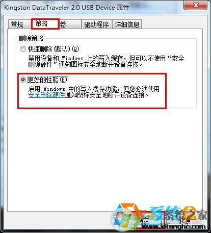 7、在”策略“选项卡中,我们对删除策略进行设置,选择为”更好的性能“,然后然定保存设置。
