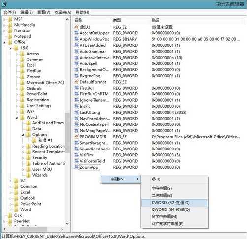 2、依次找到HKEY_CURRENT_USER\Software\Microsoft\Office\15.0\Word\Options,在注册表的右侧找到NoRereg,将值从0改为1,保存退出,打工告成!