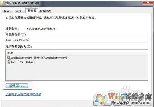3、单击要更改权限的文件夹右键,依次选择属性——安全——高级——所有者——编辑 ,把当前所有者变更为正在登录的用户,并确认。