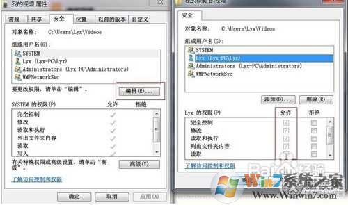 4、回到文件夹属性窗口,在安全选项中,单击编辑按钮,在弹出的对话框中,选中自己所登录的用户,在下方的权限上,全部选择允许,最后确定即可换的文件夹的管理员权限了。