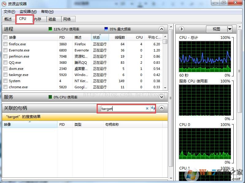 2、然后在该窗口中,切换到cpu 页签,然后在 关联的句柄中,输入 文件名(target),按下回车键,即可查找到被占用的进程;xiuchufang.com Win11系统之家。