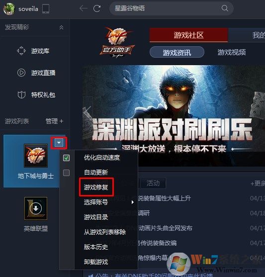 2、然后点击游戏,右上角的三角小箭头,然后我们就能看见游戏修复了