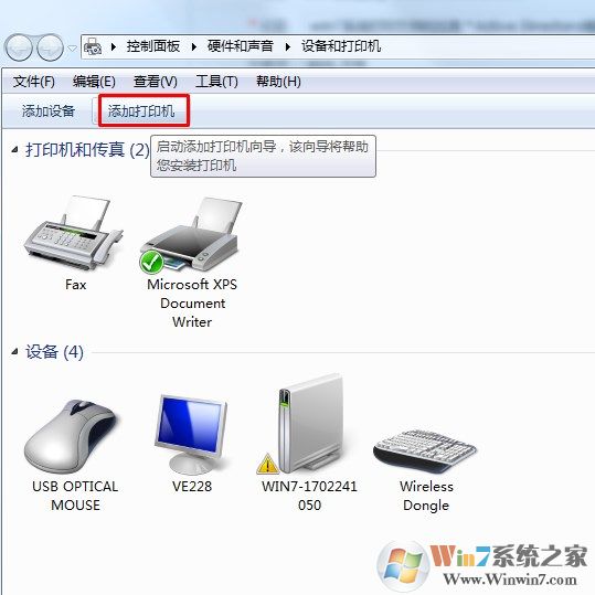 3、在设备和打印机设置窗口中点击“添加打印机”操作,