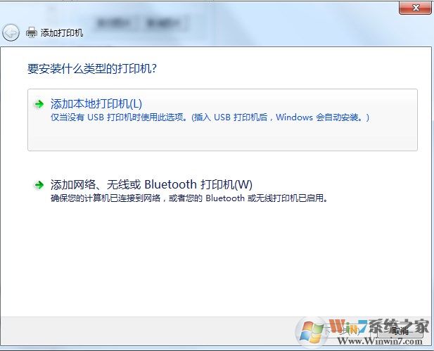 4、选择一个需要添加的打印机类型,有线或无线两种模式,如果是连接自己电脑的打印机就选择本地连接,是网络打印机的话就选择下面一个打印方式: