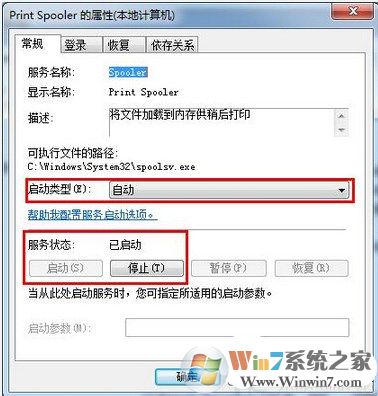 7、在弹出的print spooler属性窗口中,在常规标签下,将启动类型设置为自动,服务状态设置为启动,如果已是启动状态,先停止再启动