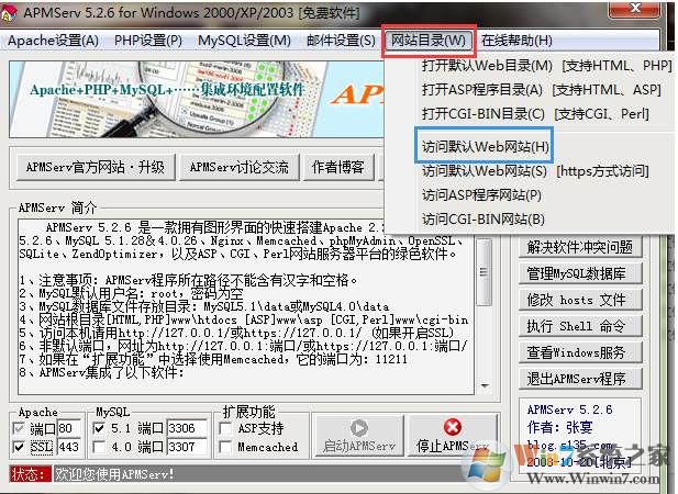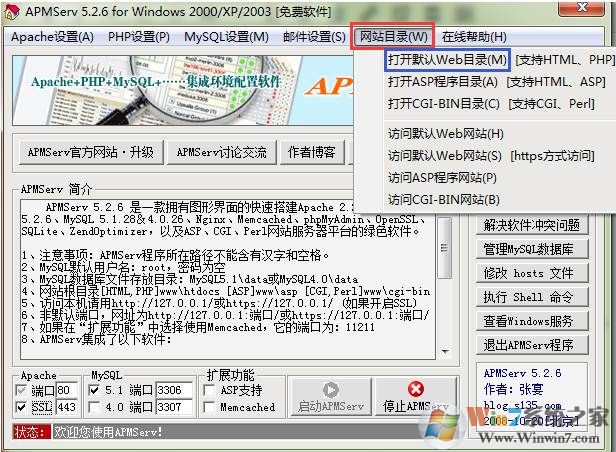 3、双击运行APMserv.exe 打开界面如下,一般会自动启动服务,没有启动的话点击一下下面的启动APMserv,:然后点击网站目录,打开默认Web目录