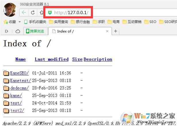 6、如上图,打开Apmserv 5.2.6工具,首先点击红色方框中的“网站目录”,再点击蓝色方框中的“访问默认Web网站”即可打开本地默认网站,如下图,此界面可以选择跟目录中存在的不同文件,从而进入不同的本地网站。