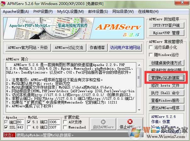 8、如上图,打开Apmserv 5.2.6工具,点击红色方框中的“管理MySQL数据库”,即可进入本地的数据库登录界面,如下图,输入名词root,密码为空即可登录到本地数据库,并对本地的数据库进行相应的管理了。