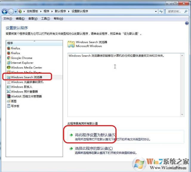 4、设置默认程序:点击选择默认程序,注意里面有很多程序。这里我们选择windows serch浏览器,设置为默认程序。如图: