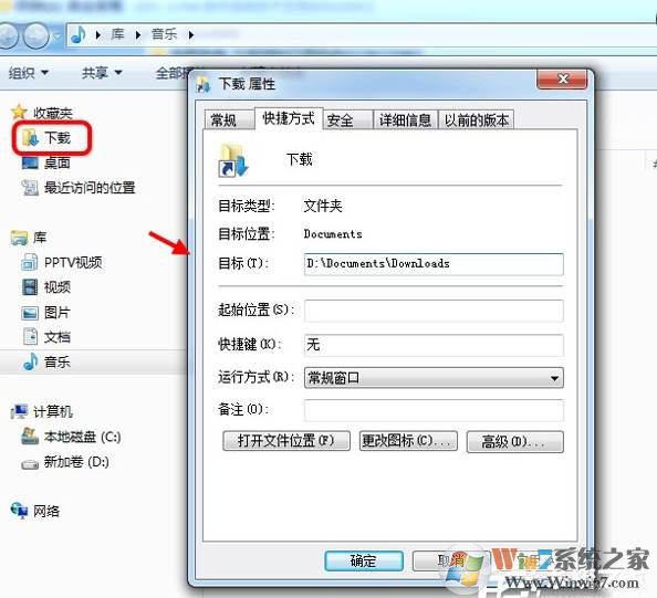 1、设好默认程序之后,你会发现下载文件夹不是空白的图标了。如果还不行,点击选择属性 把路径改成 d:\documents\downloads 这个路径文件夹一定要存在。