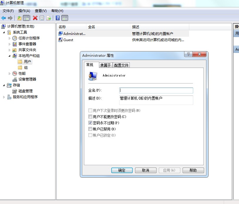 2. 鼠标点击“Administrator”,选择属性,而后在随后的对话框中去掉“帐户已禁用”之前的勾,而后关闭“计算机管理器”;