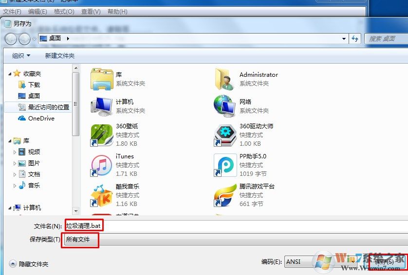 点击文件另存为,命名为 垃圾清理.bat 保存类型选择为所有文件,并保存到桌面