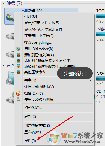 ?右键C盘,然后在弹出的菜单中选择最下面的属性,进入C盘的属性页。