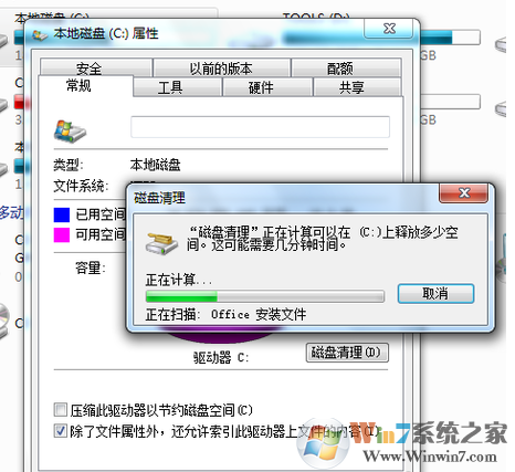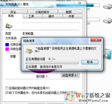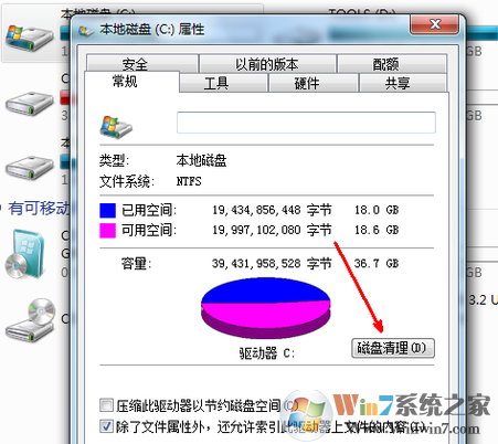 ?在属性页中,有一个磁盘清理的按钮,即清理这个磁盘的垃圾文件,用鼠标点击这个按钮。
