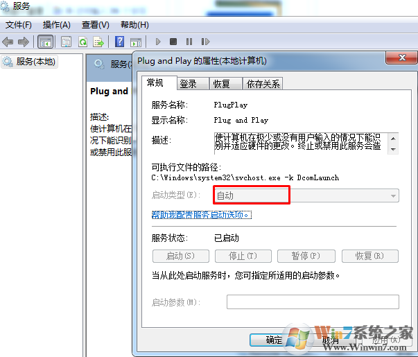 3.在Plug and Play选项的设置窗口中,将切换到常规这一栏中,然后将窗口中的启动类型这里修改为自动,最后点击确定保存设置即可。