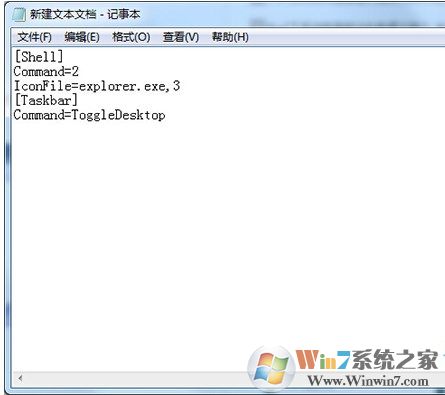 1、在桌面新建文本文档,然后代码复制粘贴进去[Shell] Command=2 IconFile=explorer.exe,3 [Taskbar] Command=ToggleDesktop。