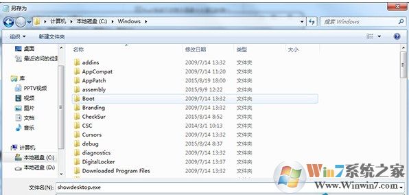 2、将文件保存在在c:\windows目录下,然后取名为showdesktop.exe