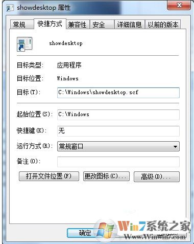 4、右键点击此图标选择属性选项,在弹出的页面中点击快捷方式,在目标选项中输入C:\windows\showdesktop.scf,也就是改一下后缀名,点击确定即可。