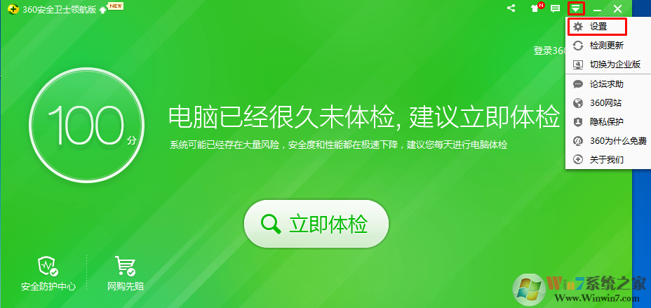 1、打开360安全卫士,点击右上角的倒立小三角,软后选择设置