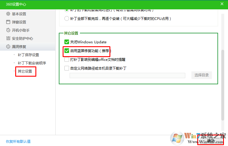 2、找到漏洞修复,然后点击最下方的其它设置,将启用蓝屏修复功能勾选即可