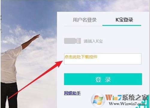 6、第一次安装会要求下载控件,点击下面的下载控件快捷链接,就会自动的下载并安装控件,完成后重新插拨K宝,就可以正常的登录中国农业银行了。