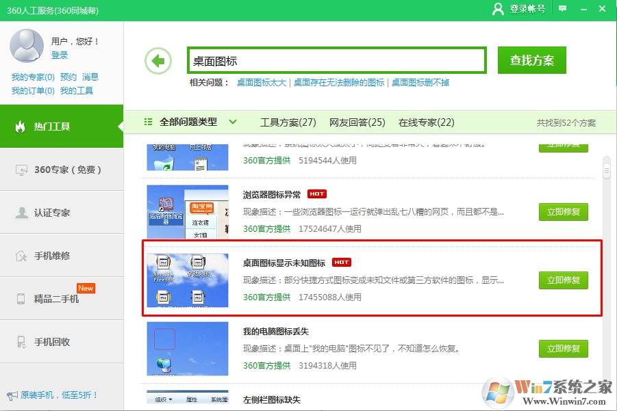 2.在弹出的人工服务窗口中,输入“桌面图标”,然后如下图所示找 桌面图标显示未知图标,点击“立即修复”按钮修复桌面图标,修复完成重启电脑即可。