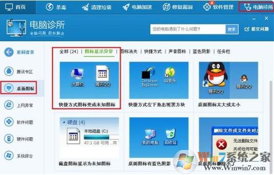 以上就是通过360安全卫士修复Win7桌面图标变成未知的解决方法了,其实安装有QQ电脑管家的也可以内置的电脑诊所中找到工具来修复。