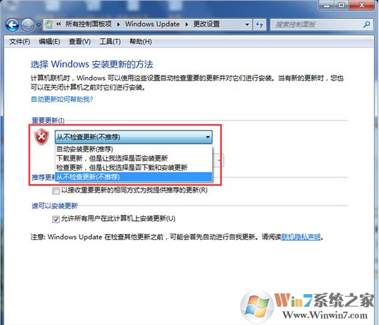在“重要更新”中选择“从不检查更新(不推荐)”,并点击“确定”。这样系统就不会更新。