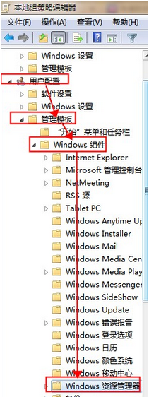 2、在组策略左侧依次展开:【用户配置】—【管理模板】—【Windows组件】—【Windows资源管理器】;