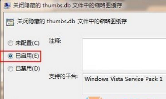 3、在右侧双击打开“关闭隐藏的thumbs.db 文件中的缩略图缓存”,点击“已启用”,点击应用并确定即可。