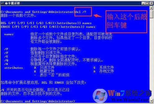 在弹出的黑色运行窗口里面输入图的:del /? ---》然后敲回车按键。