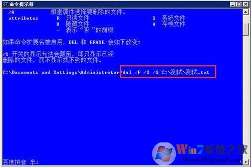 2、根据帮助信息得到命令使用方法便是:del [参数] [路径文件夹或目的文件]