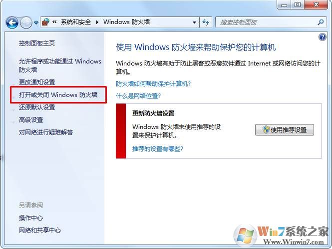 3、这时我们可以点击左侧的“打开或关闭 Windows 防火墙”,如图所示