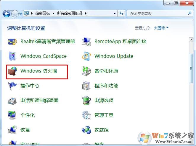 2、在控制面板中找到“Windows 防火墙”,如图所示(如果没有,那么先把查看方式设置成小图标)