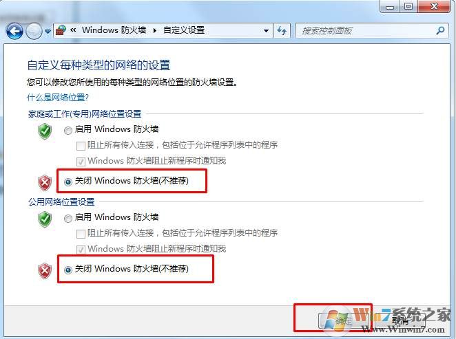 4、接下来,在专用网络设置和公用网络设置里,分别把防火墙关闭或者启用,最后点击“确定”,如图所示