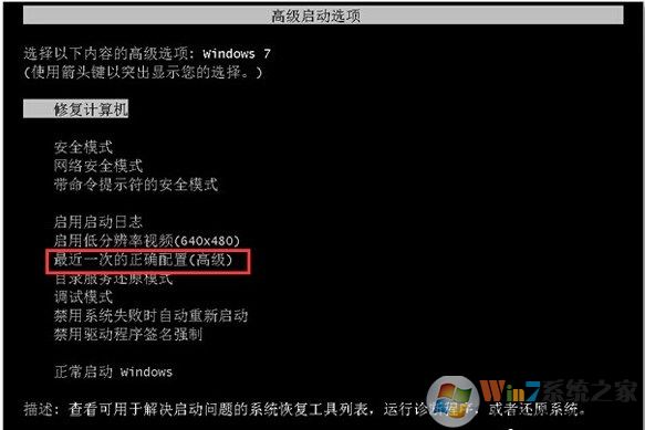 7、假如以上方法无法修复大家的Win7电脑开机无法进入系统问题。那么也是可以在开机按F8进入安全模式后选择“最近一次的正确配置”来进入系统。