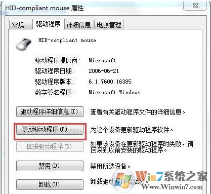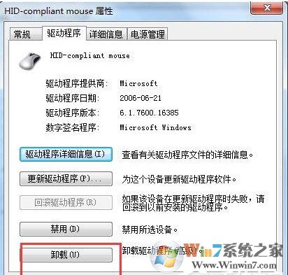 5、在鼠标属性页中,有关于驱动程序的详细信息,在最下面是一个卸载按钮,这就是卸载驱动的按钮,用鼠标点击这个卸载按钮,卸载当前的鼠标驱动。