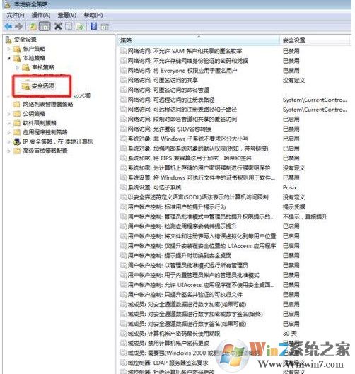 4、解决方法:我们打开“控制面板”→“管理工具”→“本地安全策略”→“本地策略”→“安全选项”→“账户:使用空密码的本地账户只允许控制台访问”。