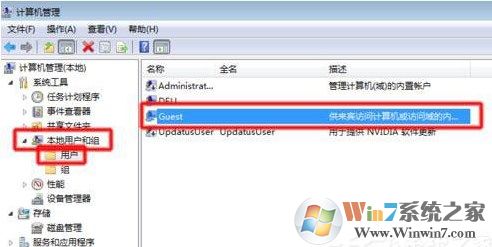 3、在弹出的对话框中选择“本地用户和组”→“用户”→“Guest”。