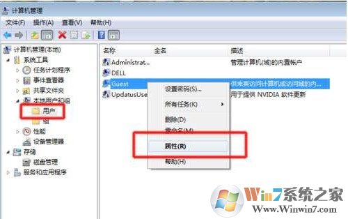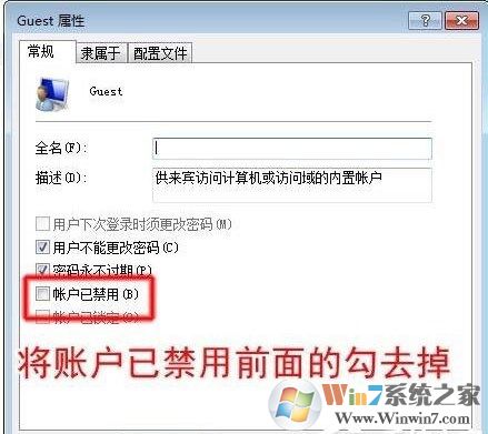 4、我们右键“Guest”属性→在弹出的对话框中将“账户已禁用”前面的勾去掉。