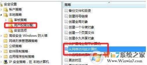 7、我们选择“本地策略”→“用户权限分配”→“从网络访问此计算机”。