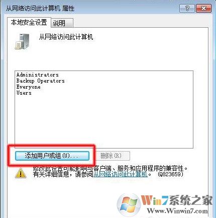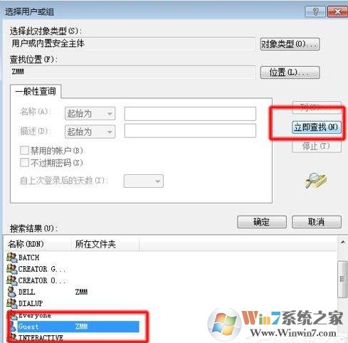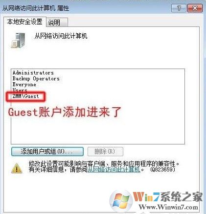 8、在弹出的“从网络访问此计算机”的对话框中添加Guest用户(方法为:添加用户或组→高级→立即查找→Guest→确定即可。)